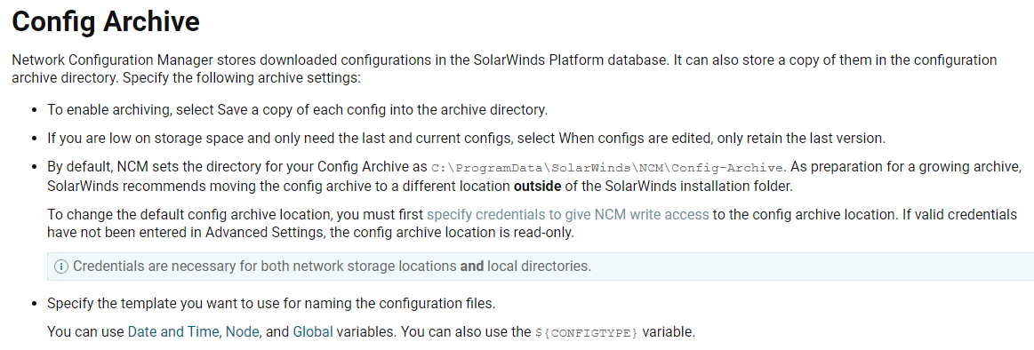 We currently backup all of our networking infrastructure using NCM. We currently hold all of the configurations for 30 days. We have had some issues pop up that it would have been good to have some older configurations to compare. We would like to keep the configurations around for 1 year.