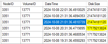 This is an example of what I am trying to get. The code above pulls the difference in DiskSize (shown in yellow in the pic), but I also want to pull the date (in blue) when the DiskSize changed. This is pic is only showing/using the VolumeUsageHistory table. I hope that helps clarify.