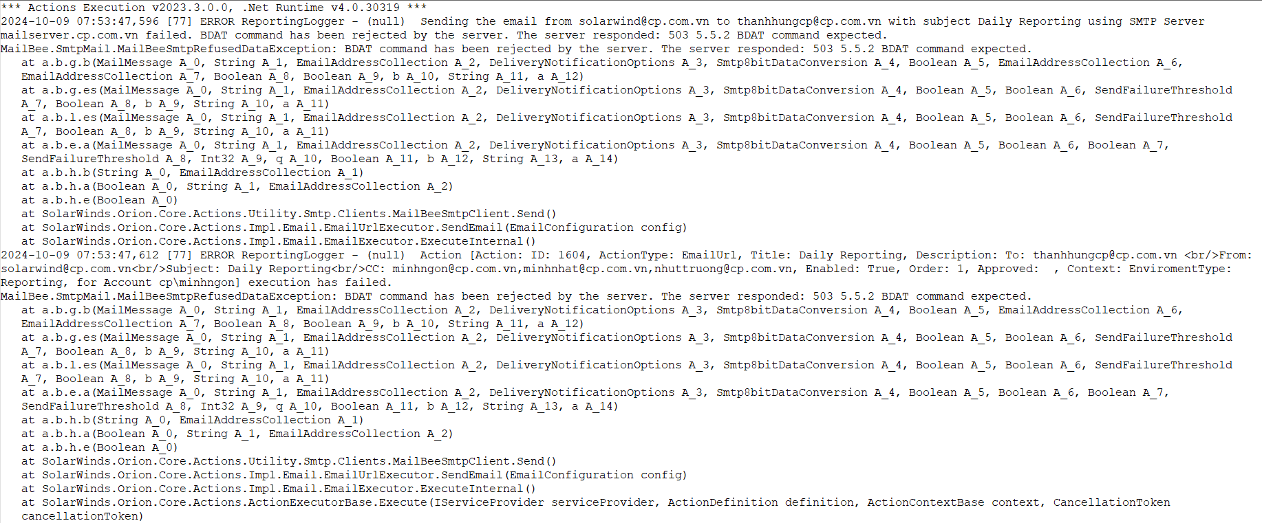 Currently I am having some issues with configuring the daily report schedule. After I actively ran the manual, it reported failure and I checked the log and saw the following error message. We still receive email alerts as usual, but for some reason we can't get report.