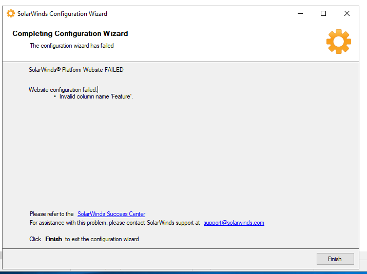 I have trouble that i restore database from platform version 2020 to latest version, in config wizard show error on SolarWinds Platform Web and the detail is Invailid column name 'Feature', show where is location of column? and how i fix this error