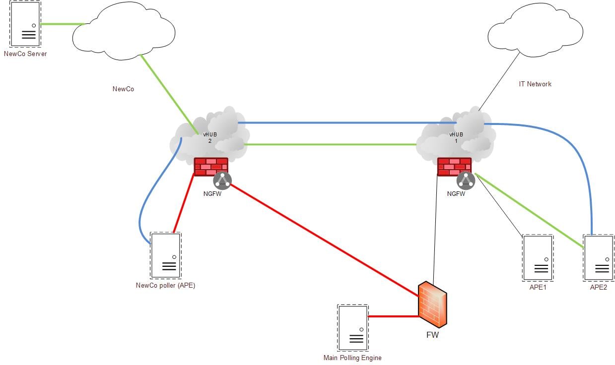 Since we needed some monitoring, I have pivoted, and used a pre-existing poller, APE2 (Azure) to monitor servers in NewCo, and have been able to do so successfully (this path is depicted in green). As well, I can monitor the NewCo APE from APE2, using the SW agent. So my thoughts are that communication is functional, or am I missing something?