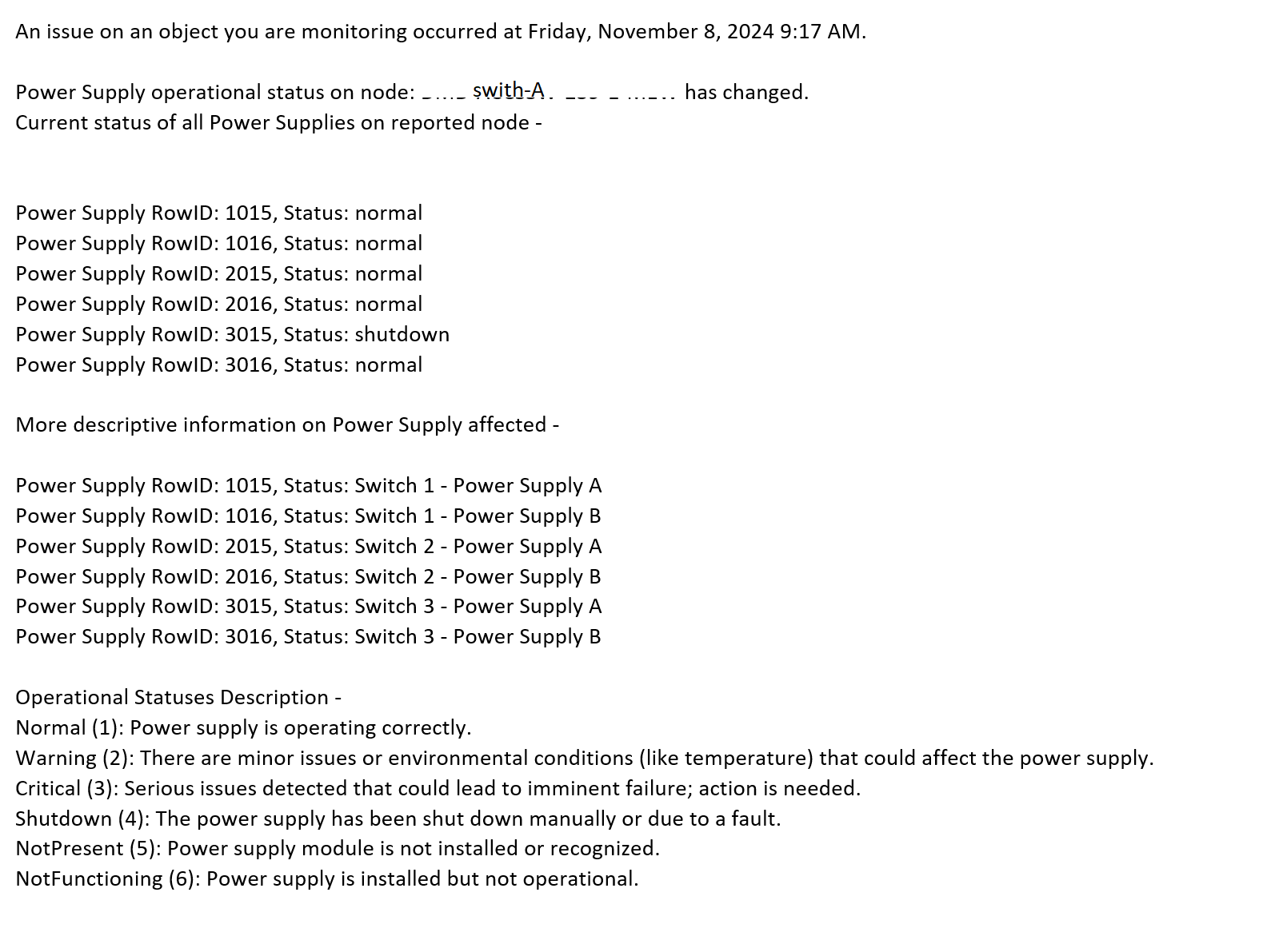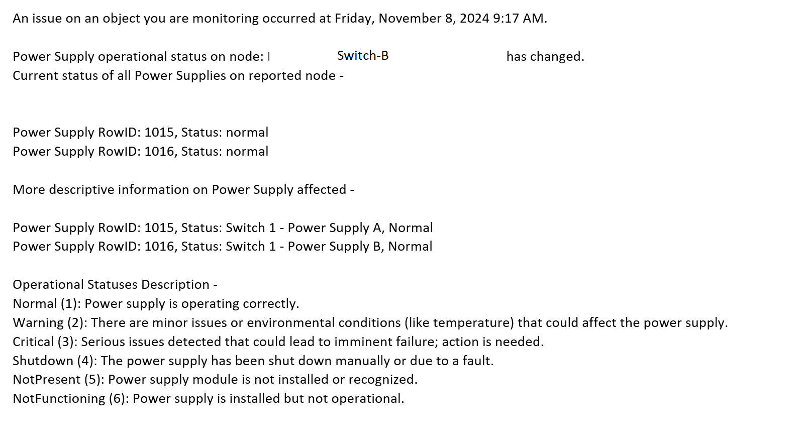 alert for all switches even though they have status on all power supply - normal. The same is on reset alert. I'm getting reset when switch with issue on power supply cleared.