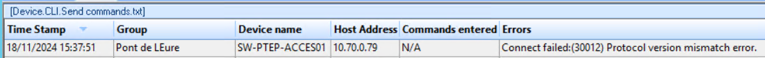 I've got an error when I run a Device.CLI.Send command : "Connect failed:(30012) Protocol version mismatch error".