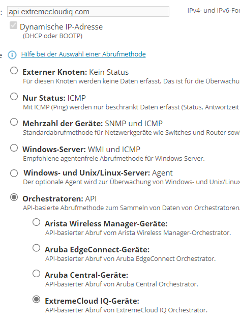 we have Extreme-WLCs and want to use the ExtremeCloud IQ-API for additional informations. I tried to add a new node, but when I choose the Extreme-Cloud Orchestrator, the Host-Name/URL-Field changes to api.extremecloudiq.com