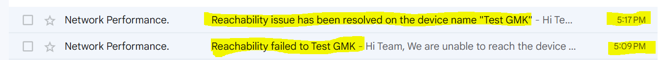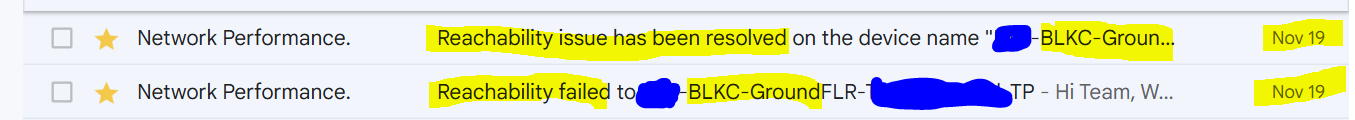I am reaching out to seek your help and suggestions regarding email alert notifications. Please see the snapshot below, where you can see two different emails for two separate device alerts received on different dates: one for a reachability failed alert at 5:09 PM today, and another for November 19. At the same time, we also received a reachability issue resolved alert at 5:17 PM today and another on November 19.