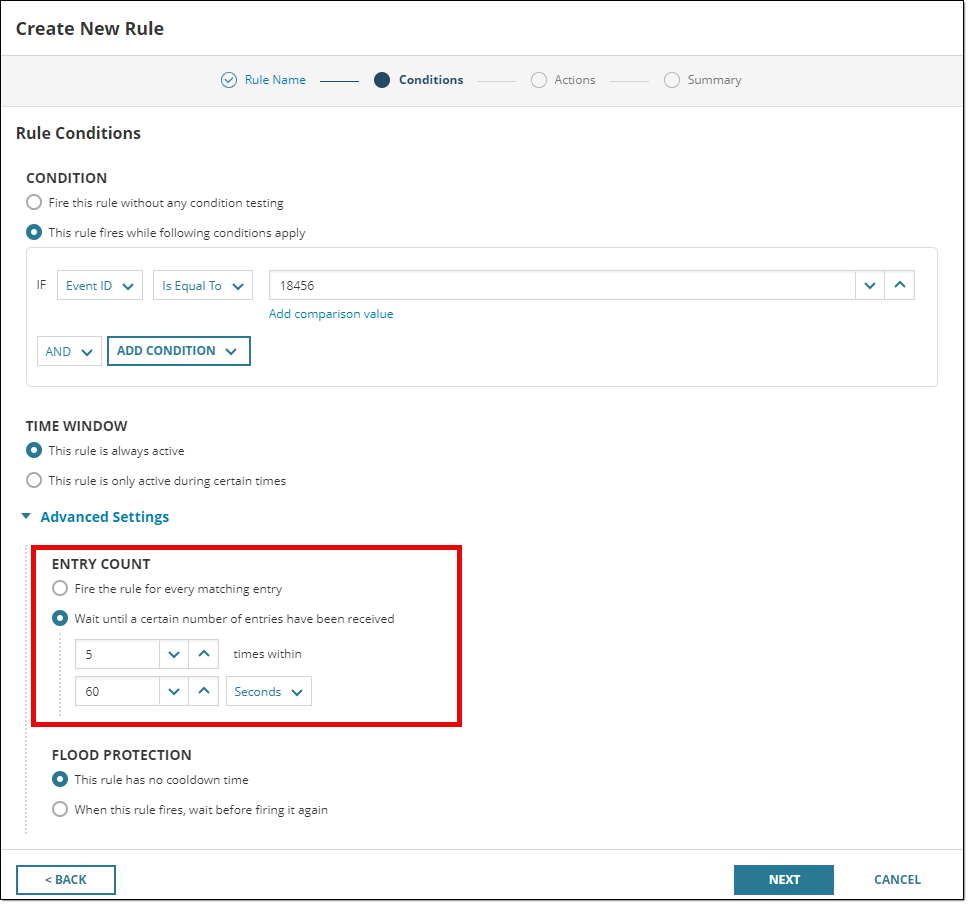 - They only want to be alerted when the event is logged in the Windows Event logs 5 or more times in a single minute.