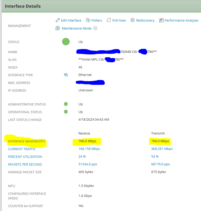 One Interface Details as shown below and the speed is configure 700Mbps. Platform version is 2024.2.0 and have NTA & NPM.