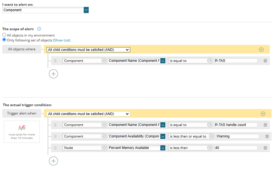 Obviously, this won't work because the trigger condition never matches the objects - i.e. there are never any objects matching these conditions. If I put <handle count tracker for a process that is spawned by that service> in the "objects", then SolarWinds' standard service restart utility (APMServiceControl.exe ${N=SwisEntity;M=ComponentAlert.ComponentID} -c=RESTART) won't work as it only works on services, not processes.
