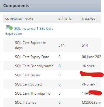 The statistical data for "SQL_Cert_Expires_Days","SQL Cert FriendlyName","SQL Cert Issuer","SQL Cert Subject","SQL Cert Thumbprint","SQL Instance" is set to 0 (zero) as you are interested in the string values.