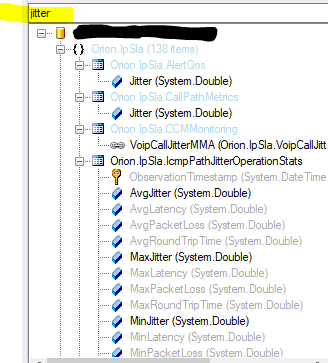SELECT TOP 500 Nodes.NodeID , Nodes.Caption , Nodes.IPAddress , Nodes.DNS , Nodes.Vendor , Nodes.snmpversion , Nodes.ObjectSubType as PollingMethod ,[Nodes].Engine.ServerName as PollingEngine , Nodes.LastBoot , [Nodes].IPSlaOperations.UDPJitterOperationStats.AvgJitter--Lat/Long , [Nodes].WorldMapPoint.Latitude AS [Latitude] , [Nodes].WorldMapPoint.Longitude AS [Longitude]-- , [Nodes].CustomProperties.DepartmentFROM Orion.NodesOrder by [Nodes].Caption
