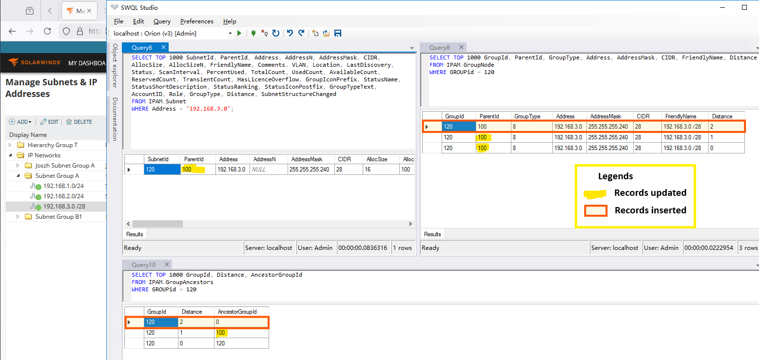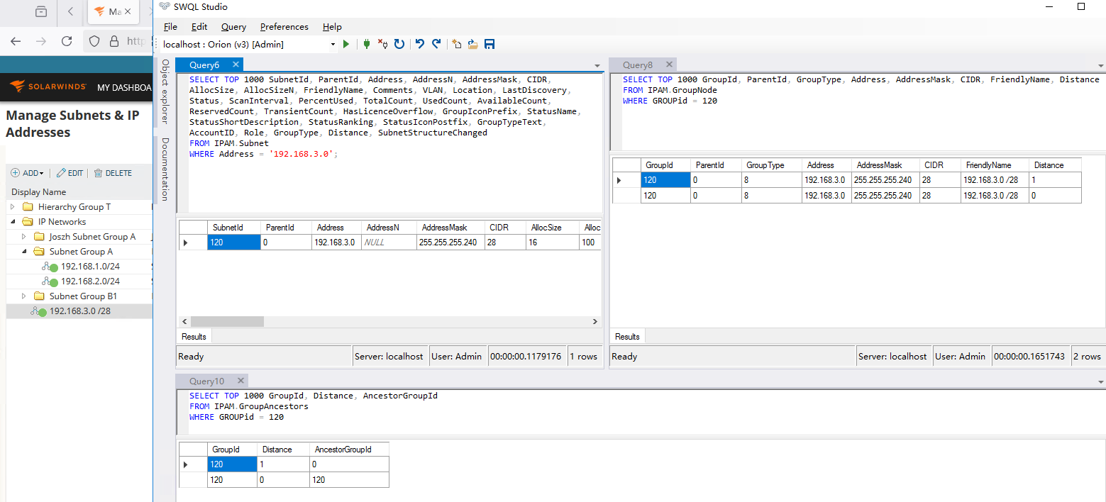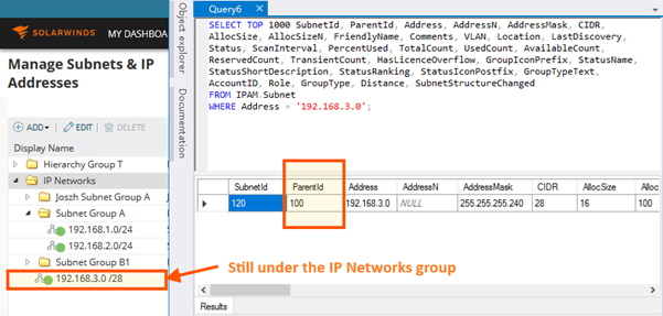 I am looking for a way to create a new IPAM.Subnet, 192.168.3.0 /28, to an existing Group using the RESTful API approach. I have visited the Orion SDK Swagger Doc and learned that there is an endpoint, /CreateSubnetForGroup, to do so. Also, I have created a new Group, "Subnet Group A" and the Group's SubnetId is 100 (checked in the SWQL Studio).