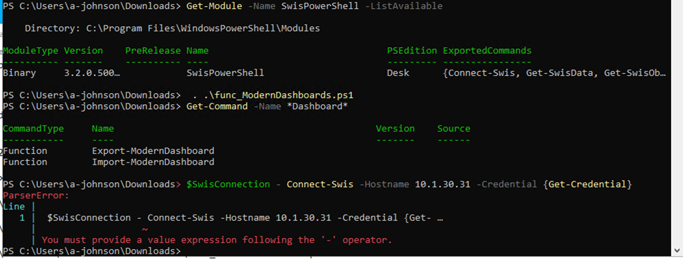I am trying to export Modern Dashboards to my SolarWinds HCO 2024.4.0 server. I have downloaded the func_ModernDashboards.ps1 and Modern Dashboards .json files.