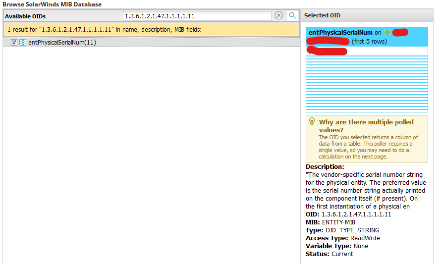i continue with the 'SysObjectId' data source, since it is populated with the system OID and we never actively use that information for anything. I edit it, then browse OIDs and search for the OID i've found that holds the service tag, as also seen in the snmpwalk image, which cannot be found. But if i remove the long number after the last period, at the end of the OID, i can find the following, which i continue with. Please notice the output includes several empty lines.