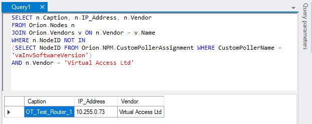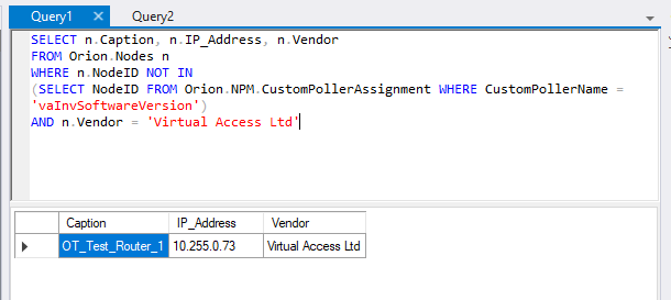 (SELECT NodeID FROM Orion.NPM.CustomPollerAssignment WHERE CustomPollerName = 'vaInvSoftwareVersion')