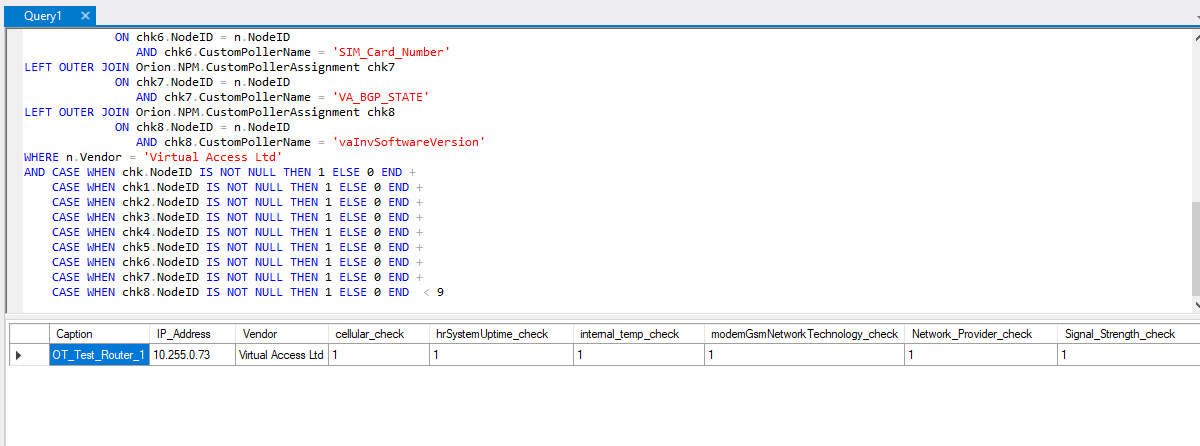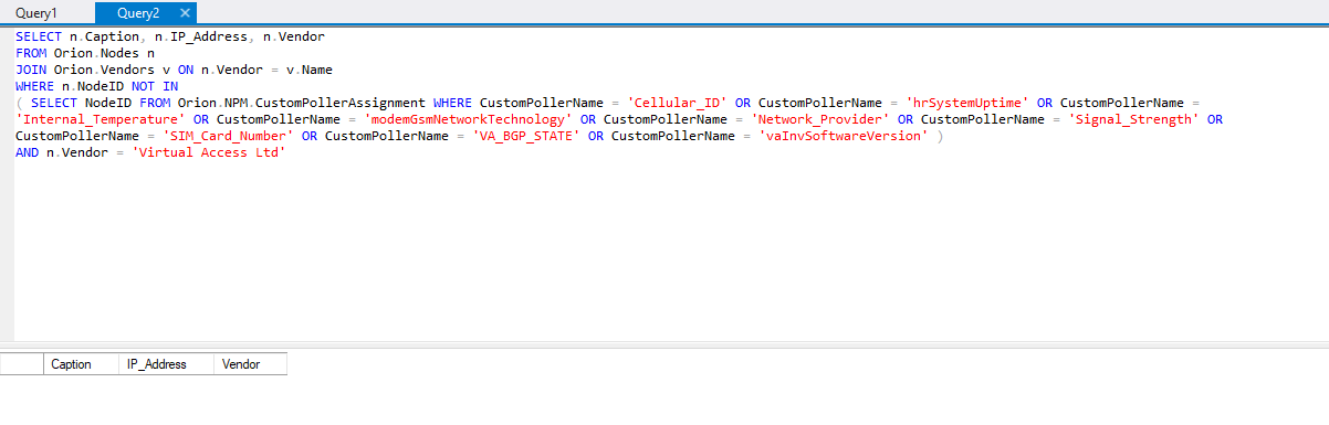 ( SELECT NodeID FROM Orion.NPM.CustomPollerAssignment WHERE CustomPollerName = 'Cellular_ID' OR CustomPollerName = 'hrSystemUptime' OR CustomPollerName = 'Internal_Temperature' OR CustomPollerName = 'modemGsmNetworkTechnology' OR CustomPollerName = 'Network_Provider' OR CustomPollerName = 'Signal_Strength' OR CustomPollerName = 'SIM_Card_Number' OR CustomPollerName = 'VA_BGP_STATE' OR CustomPollerName = 'vaInvSoftwareVersion' )