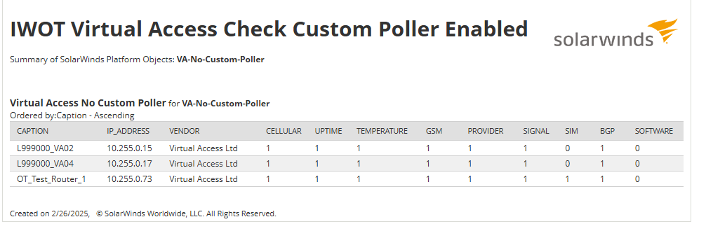 There are hundreds of nodes with these custom pollers applied. The aim of the report is to list any nodes with vendor 'Virtual Access Ltd' and missing expected custom pollers being applied to them.