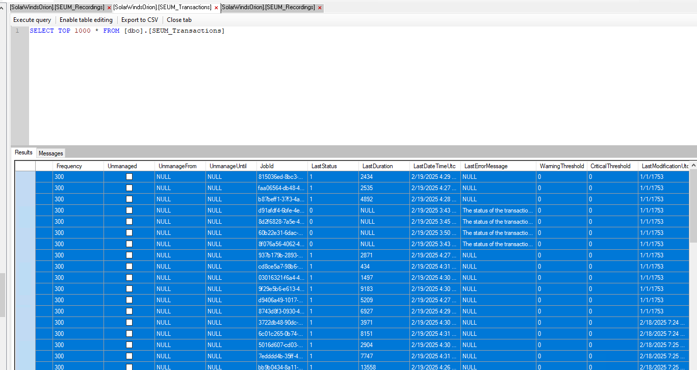 Debug logs on the WPM players in question do not indicate any errors (typical minor errors in the logs), although if you look at the Orion.SEUM.Transactions table most of them have a LastModificationDate of 2/18/2025 around the time the main platform was upgraded. If you look at 13 of them, they have a date of 1/1/1753 (pretty funny)