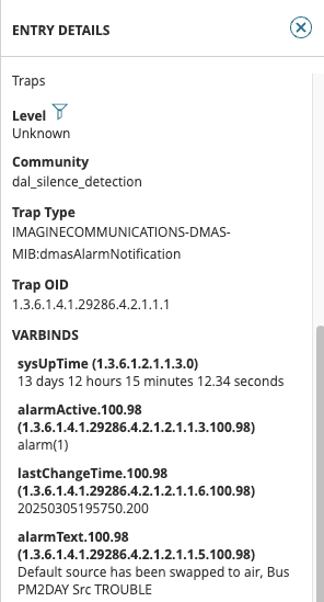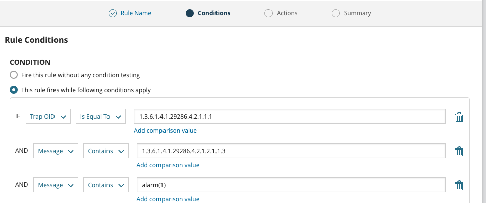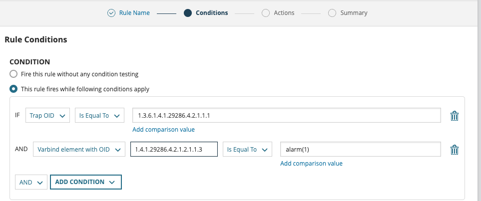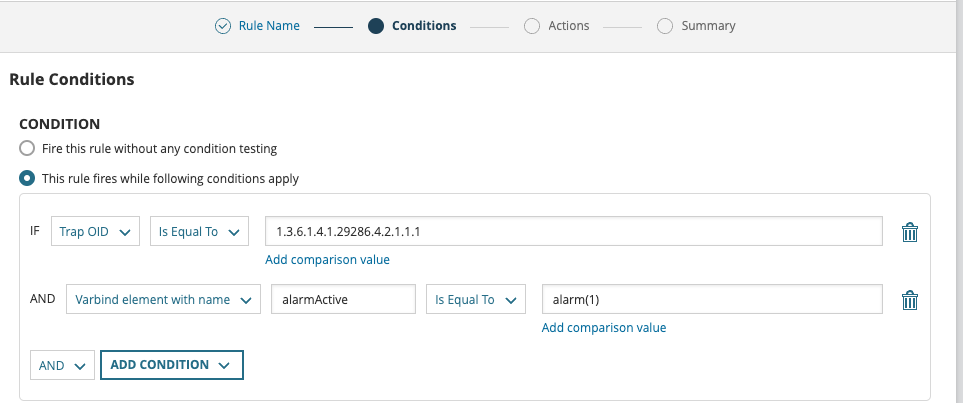 - The trap must have Varbind called 'alarmActive'. This varbind from the example above is: alarmActive.100.98 (1.3.6.1.4.1.29286.4.2.1.2.1.1.3.100.98) where the first part (1.3.6.1.4.1.29286.4.2.1.2.1.1.3) is always the same and the last two integers are variable (100.98) in the example.