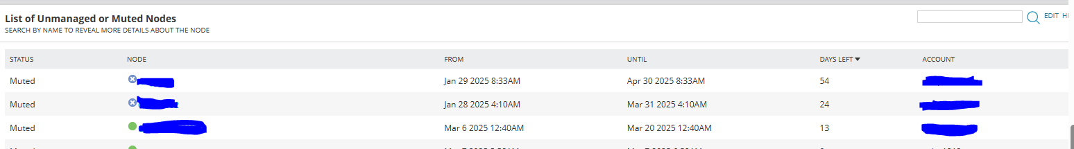 WHERE ae.auditingactiontype.actiontype = 'Orion.NodeUnmanaged') ae ON ae.NetObjectID = n.NodeID and ae.timeloggedutc=mostrecent.recent