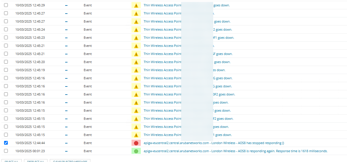 When the Aruba API goes down, I get tons of emails that all Access Points are offline:
