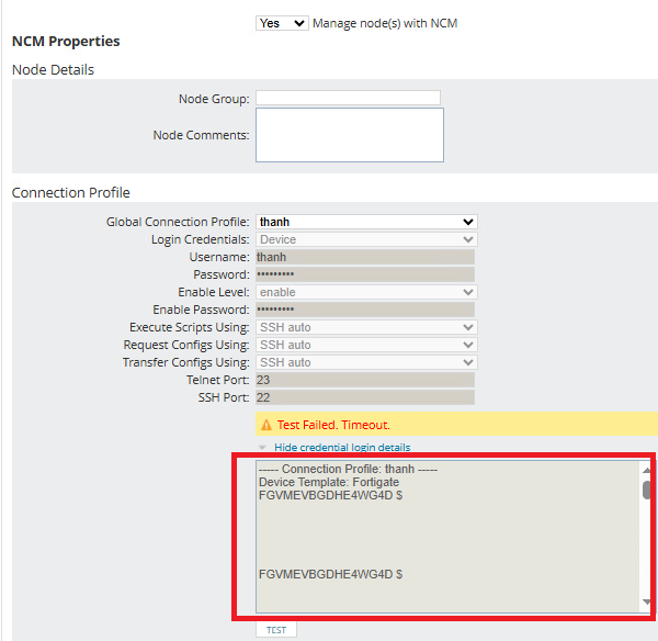 In SolarWinds Orion, I add a new network device (Exp: Fortigate VM) and enable "manage node(s) with NCM". Then, I test connection profile with end device.