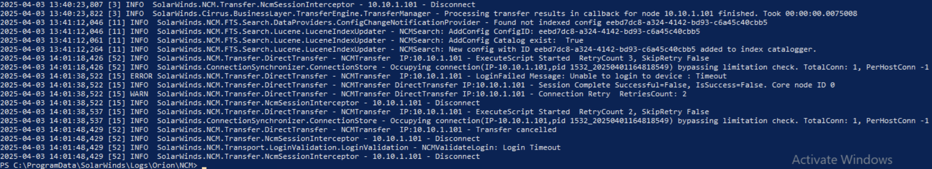 In additionally, I have found a NCM module logs at "C:\\ProgramData\SolarWinds\Logs\Orion\NCM\NcmBusinessLayerPlugin" but it only show content of session.