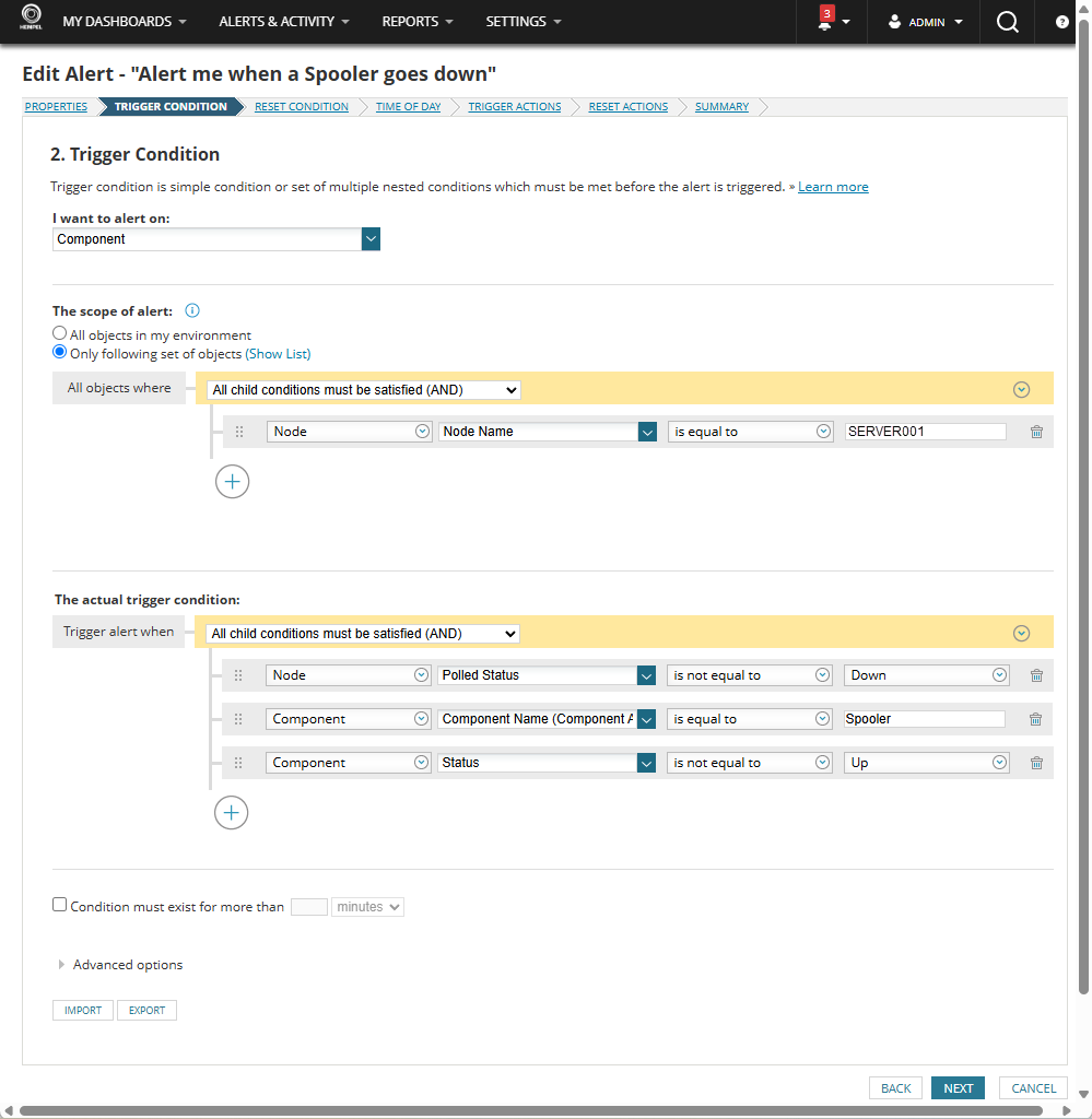 I'm trying to set up an alert that should send me an email when the Spooler service (Print Spooler) on the server SERVER001 goes down. I thought it was a simple and fairly obvious alert but yet I am really confused constructing a working query/condition. There's probably been a lot about this already but I haven't found anything to help me in a few days. This is what I set in my last approach - obviously it doesn't work. I also created the working Spooler Service Monitor Template and tried to trigger the alert on that one but it didn't work. I would really appreciate your help.