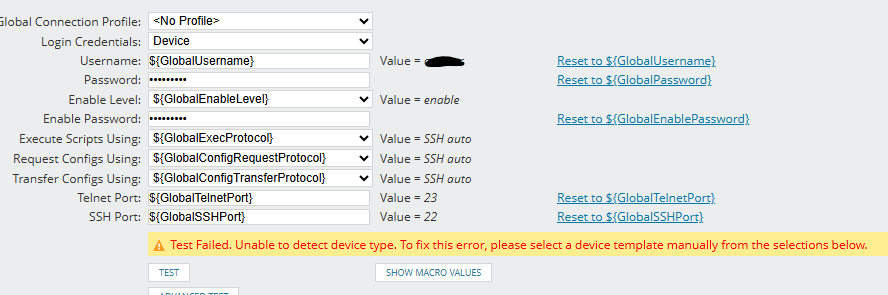 (3) The node is not correctly configured for NCM. The simple sets are to go into the node properties and make sure that Manage node(s) with NCM is enabled. Next make sure the correct global connection profile is selected. Double check all the settings to validate if the correct request/transfer/ports are being used. If your presented with the Show Macro Values, select it to see the variables used.