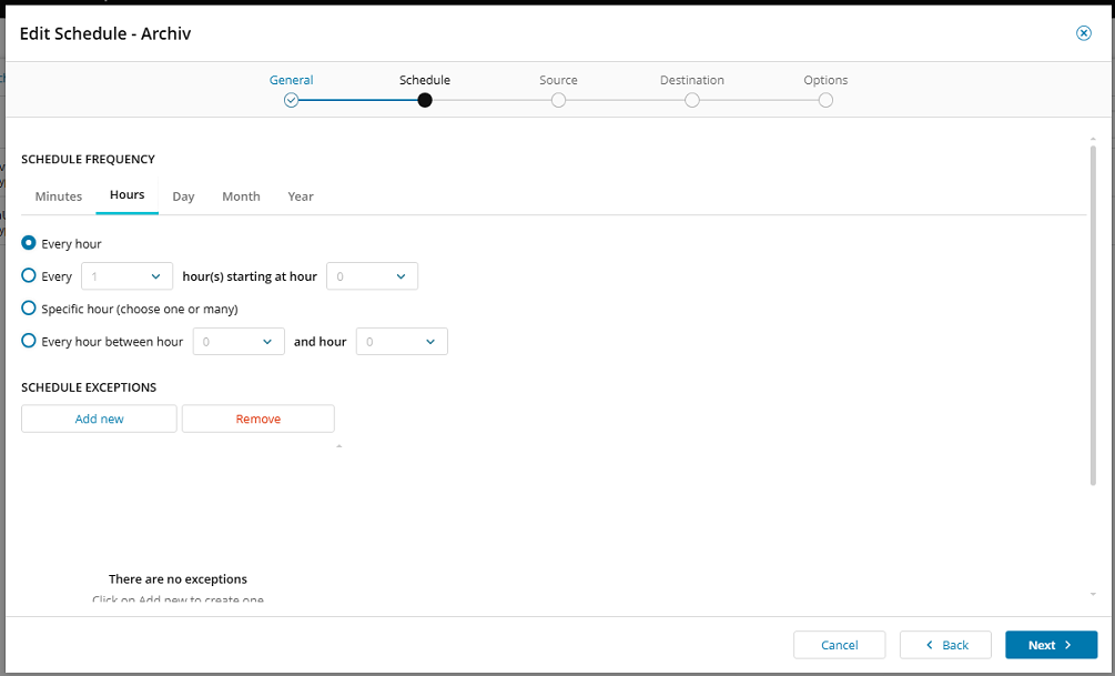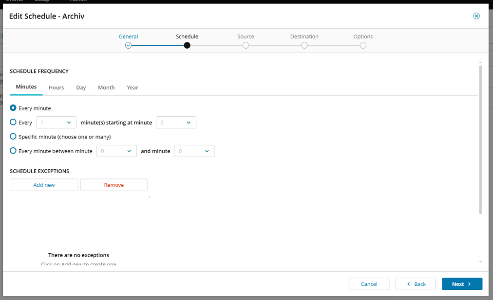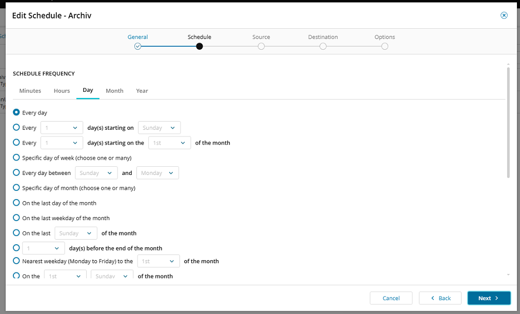 Sorry, i don't really understand the schedule in KSS NG: when I simply want to perform a daily archive job, I have to choose one of the 'every day' options, otherwise it will always do it every minute?! How for example can I set an archive job for every day at 8pm?