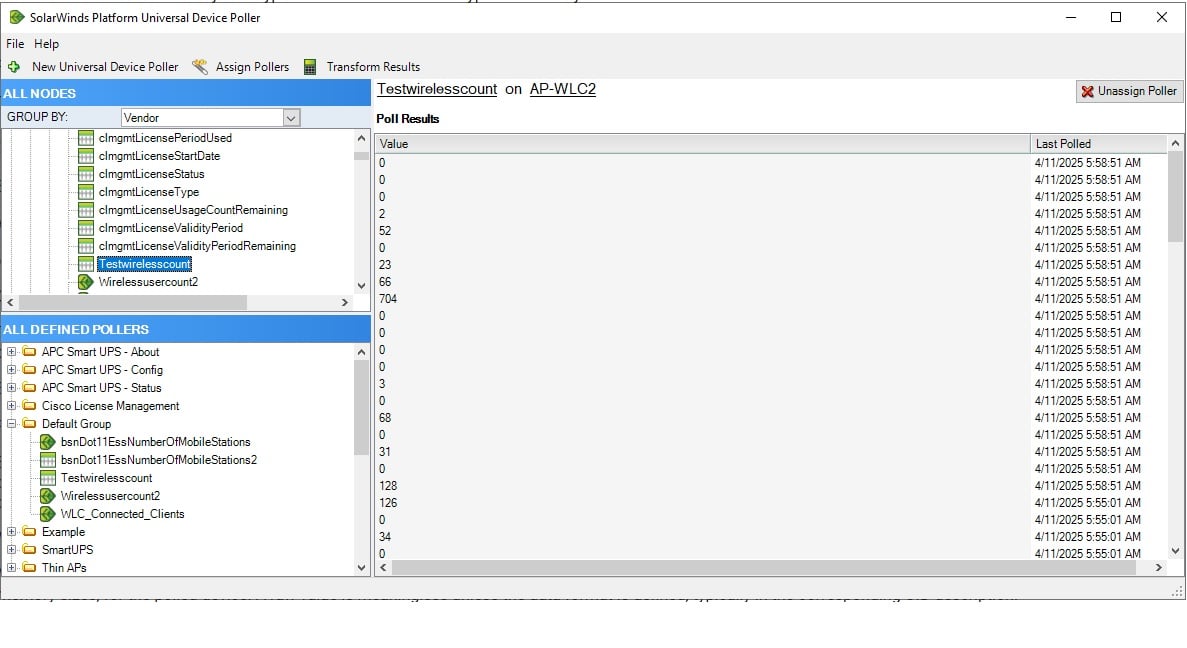 So I have been working on creating a graph that shows the number of wireless users that are connected to the network. I understand that this was fairly easy with the older Cisco 5500 series controllers but Cisco seemed to have dropped what the OID reports in the 9800. This being said I recently learned that using OID 1.3.6.1.4.1.14179.2.1.1.1.38 I am able to get the exact number of users that are connected to each of the different SSIDs that are configured on the controller. I am looking for a way to display this on a graph.