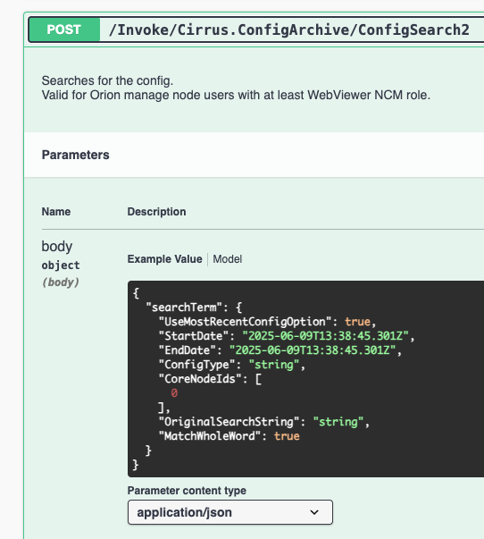 I currently have an old tool that uses SolarWinds SDK and SWIS commands to download all switch configuration files. It then does a keyword lookup on the downloaded files to search. I would like to change it and build proper APIs to search switch configs directly from Orion (hopefully via API and not DB query). Is this possible? If so, please provide the api page.