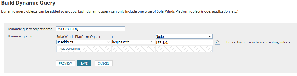 I'm creating Dynamic Queries to populate groups with our server and network nodes based on location, using the Manage Groups GUI and its built in dynamic queries. I want to query by IP address as it's our most reliable identifier of location at the moment. However, most of our subnets are larger than /24's, which leads me to the problem: the group dynamic query builder seems to only use "AND" logic for its conditions, and I don't see a way to change that. So, for example, if I have a network, 172.1.0.0/23, which might contain server or network nodes anywhere in its range, I'd have to build two dynamic queries in the group, one with the logic "IP Address begins with '172.1.0.'", and one with "IP Address begins with '172.1.1.'" Double it to four queries if it's a /22, and so on. Since it only uses AND logic if you have multiple conditions, and an IP can't start with BOTH of two different strings.