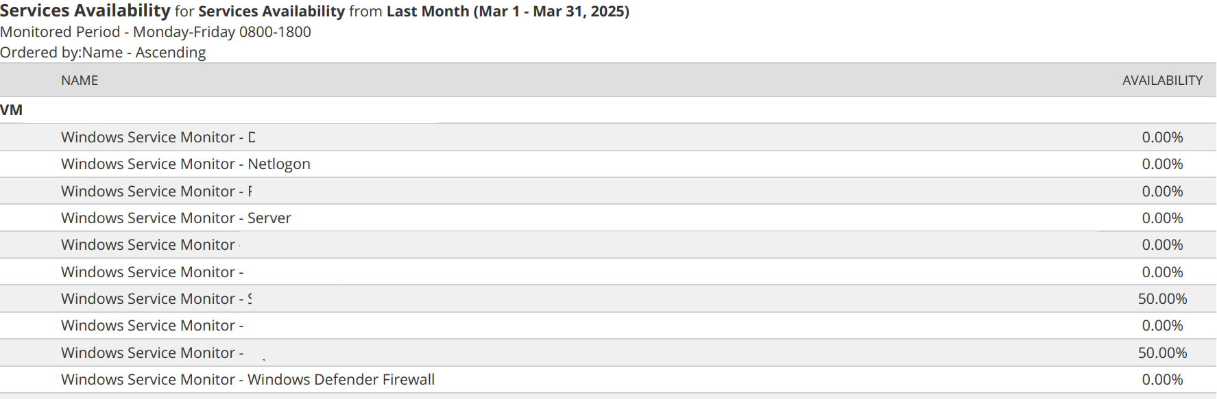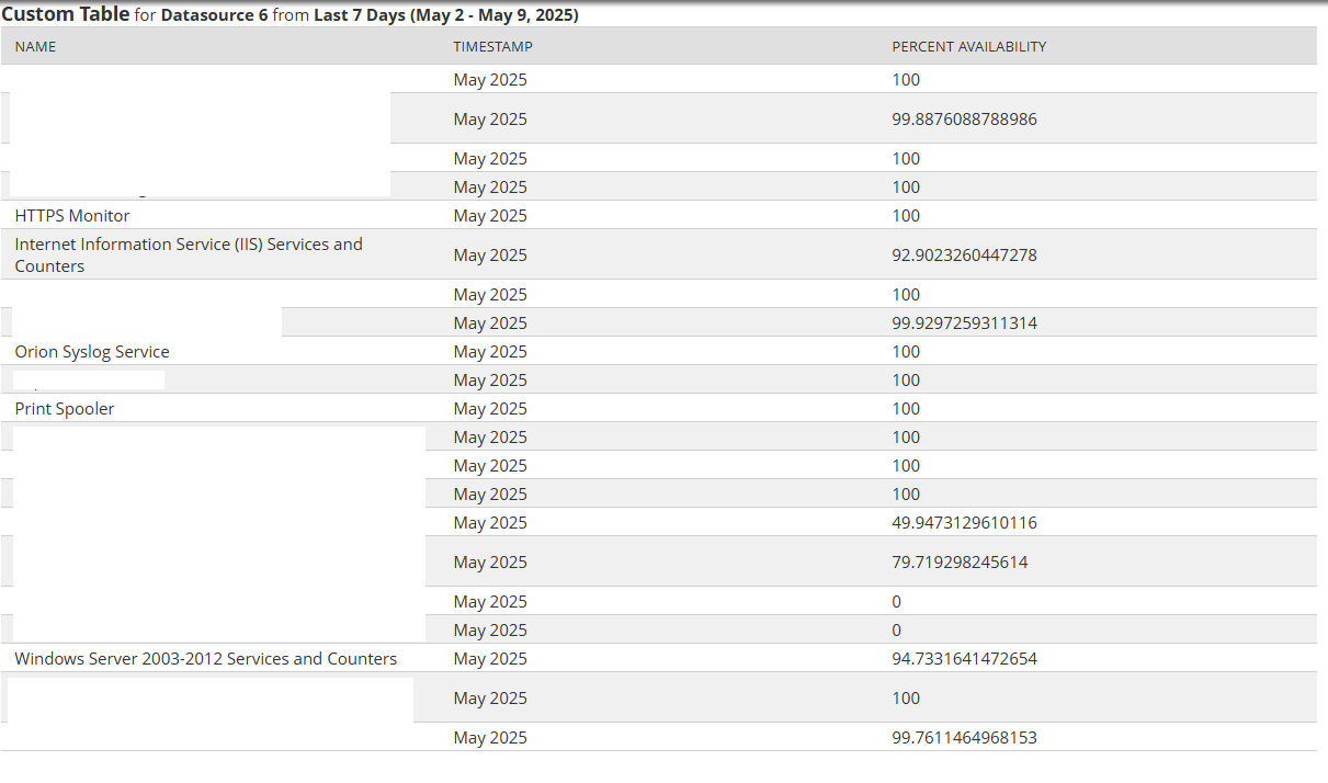 I would like to create an application service availability report that displays the following information;