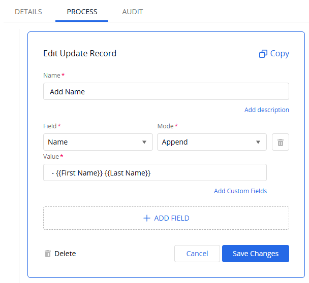 When we try to reference the custom field names, the request name just gets updated the variable names and not the values of the variable.