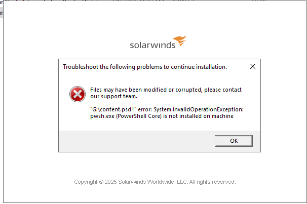 During the upgrade install the SolarWinds Offline installer may throw below error: kindly helps us to resolve this issue..