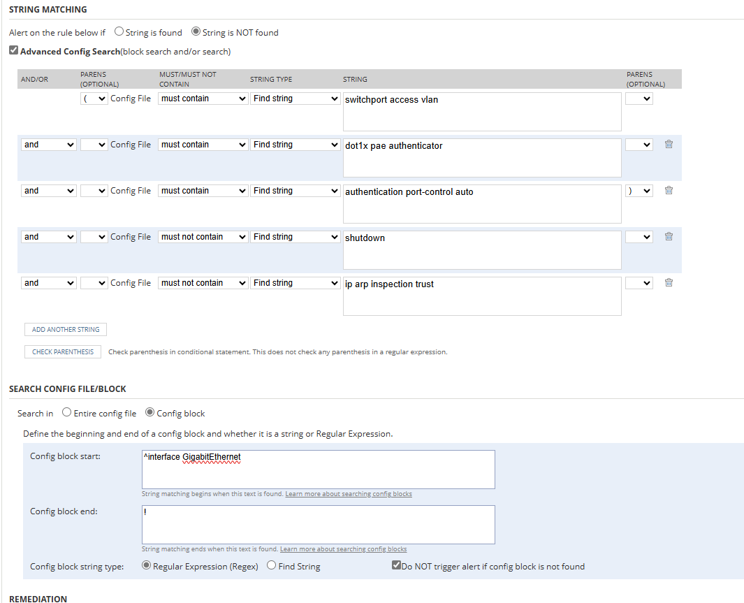 if i change the config block start to something like switchport access vla \d\d it will skip all the shutdown ports but my remediation script wouldnt know which interface to change. if i use the config block like i have in picture it all works but it detects the shutdown interfaces