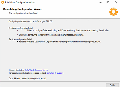 • • Failed to configure Database for Log and Event Monitoring due to errors when creating default rules.