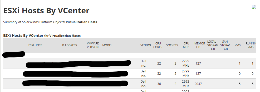 SELECT N.Caption, H.HostName, H.IpAddress, S.StatusName, H.VMwareProductVersion AS VMware_Version, H.Model, H.Vendor, H.ProcessorType, H.CpuCoreCount,
