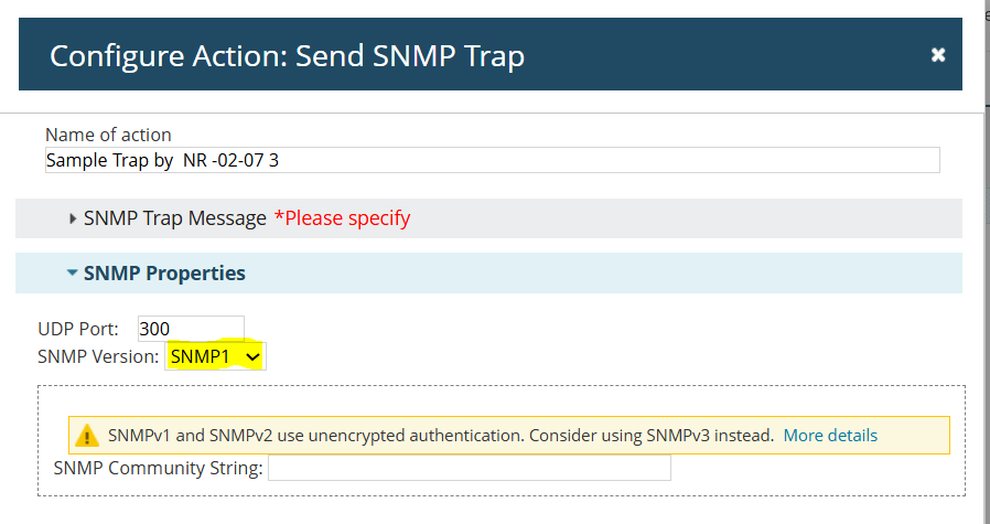 However, when we investigate the alert in the dashboard, we find that the SNMP trap is configured as type SNMPv1 instead of SNMPv3.