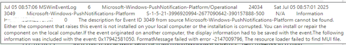 The description for Event ID 2050 from source Microsoft-Windows-SystemDataArchiver cannot be found. Either the component that raises this event is not installed on your local computer or the installation is corrupted. You can install or repair the component on the local computer.If the event originated on another computer, the display information had to be saved with the event.The following information was included with the event: [SDP Base] SRUM calling QueryStatsEx with reason 0 into provider Network Provider.. FormatMessage failed with error -2147009796, The resource loader failed to find MUI file.