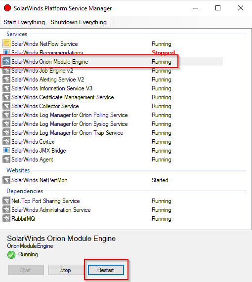 Once this is completed you will also need to restart the SolarWinds Orion Module Engine.