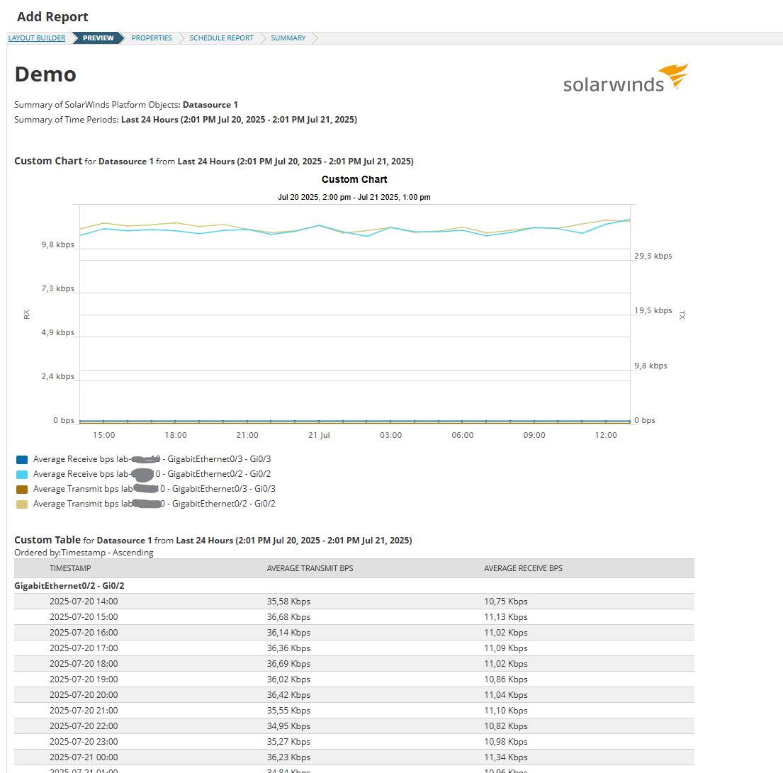 I’m trying to set up a report in NPM that shows hour-by-hour bandwidth usage for a few key interfaces on our core switches. I’ve played around with custom reports, but I can't seem to get a clean hourly breakdown — it keeps aggregating by day or minute.