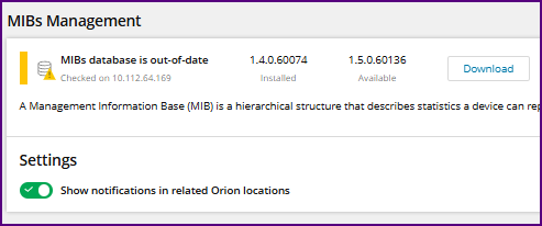 You cannot create a classic alert for outdated MIBs (Management Information Bases) directly in SolarWinds using the standard alerting engine. However, SolarWinds platforms starting with the Orion 2020.2 release provide a built-in notification feature in the web console