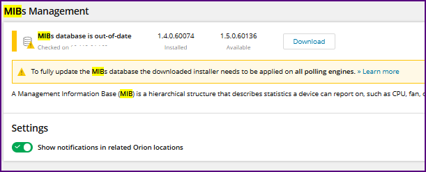 When the MIB database bundle is out of date we can see this in the Web UI as follows: