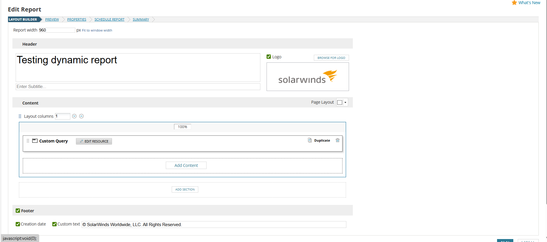 I have created a custom SWQL query report, but when I try to enable search using the "Search SWQL Query" option, the search field doesn't appear in the output.
