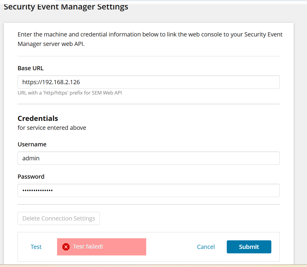 I'm stuck here trying to connect to my SEM Web API from my SolarWinds Observability console SEM settings