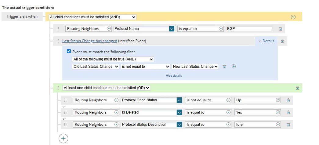 I am trying to configure alerts for Routing Neighbors (OSPF and BGP). I have used the logic below to build out the alerts. I am seeing the interfaces going down with the out-of-the-box alerts but I seem to be missing the trigger for the routing neighbors. This is currently alerting on Routing Neighbors. Any help would be greatly appreciated.