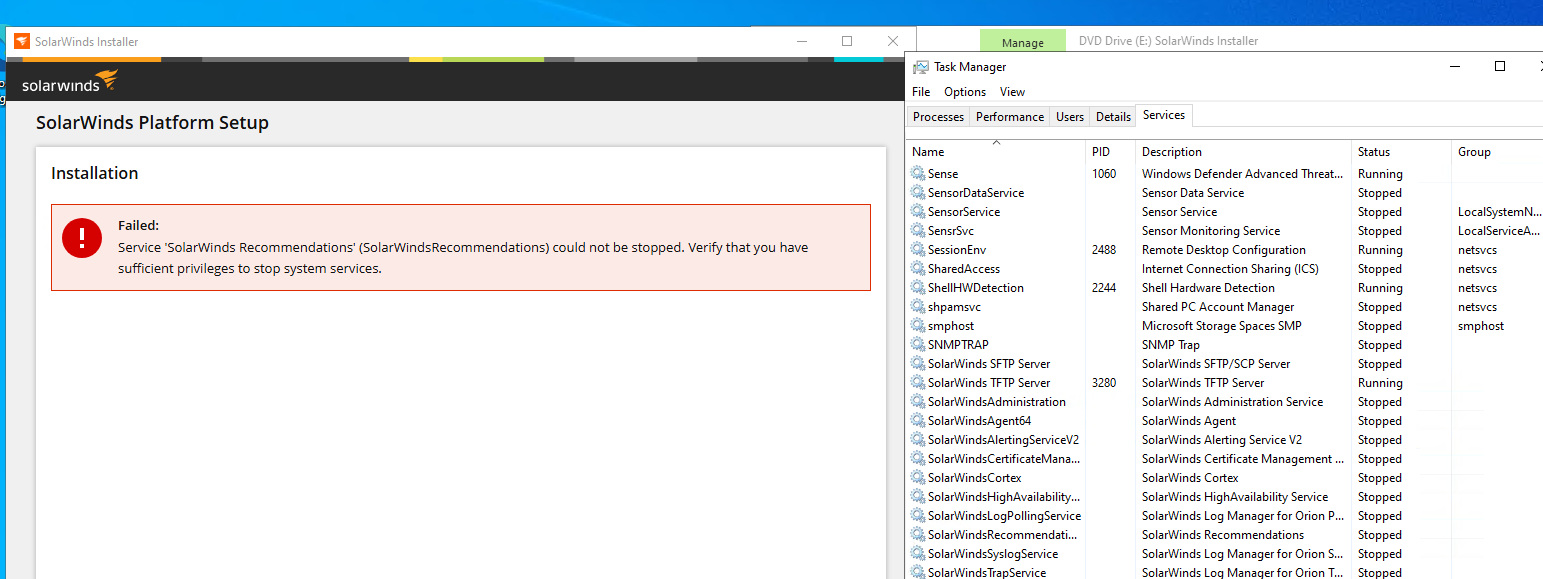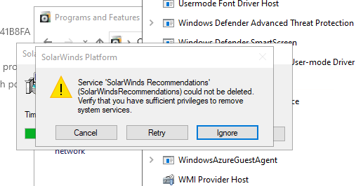 When performing the install the SolarWinds installer prompted me with an error stating it was not able to stop the SolarWindsRecommendations service due to some permissions issue.