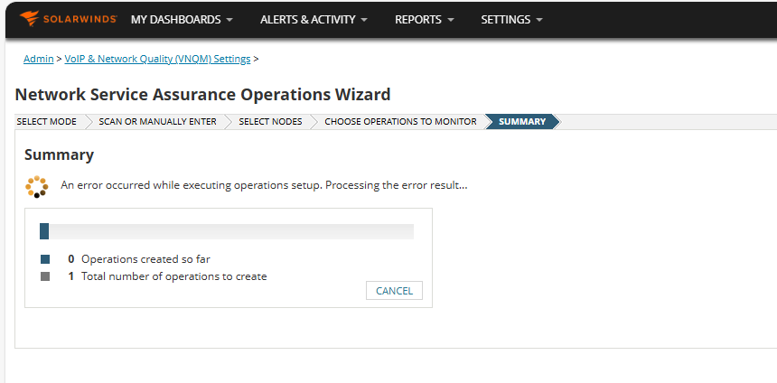 Dears, I added a new icmp-echo SLA on my Cisco router, and when I am trying to add it to the SolarWinds for monitoring, I got below error and even I cannot cancel it.