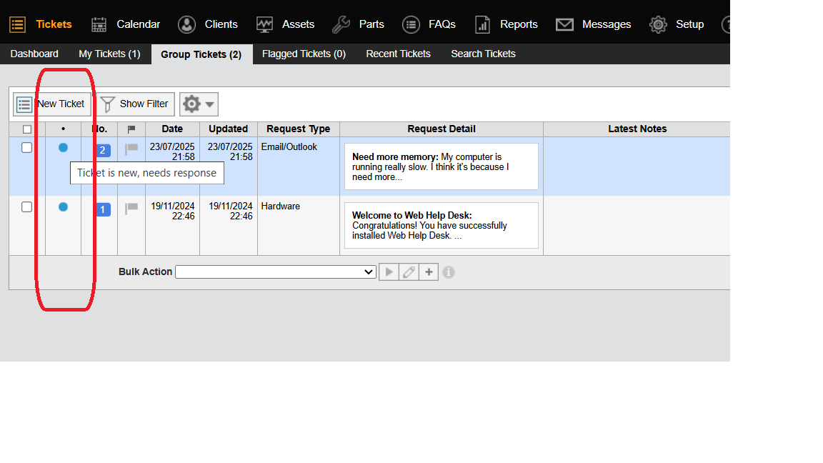 Hi nelsonm, Is my understanding correct that you want flag/indicator to quickly show whether a ticket contains tech notes. We do have one option in advanced search for tech notes, We can filter tickets which has tech notes with the help of Ticket activity widget.